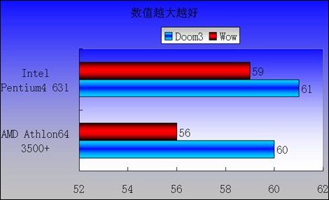 概述:实际游戏测试中,笔者进行了经典OpenGL游戏Doom 3与现在流行的网络游戏魔兽世界的测试,成绩还是有较好的代表性的。无论是在OpenGL游戏还是在DirectX 3D游戏中,Intel Pentium 4 631都占据了一定的优势,AMD Athlon 64 3500+以数帧的差距落后。最佳游戏处理器的头衔看来已经不是AMD能够鼓吹的卖点了。