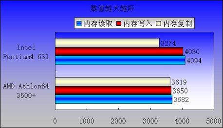概述:以下数据显示AMD Athlon64 3500+ 除了在内存复制方面比Intel Pentium4 631有优势外,在内存读取、写入 Intel Pentium4 631都要占上风。因AMD在内存规范支持度的扩张,间接导致了部分分频率的AM2处理器无法完美的运行在高频率的环境下,在部分对内存带宽要求敏感的测试项目中,出现的成绩稍微下降的情况。在这方面Intel Pentium4 631要比AMD Athlon64 3500+ 表现得更加出色。