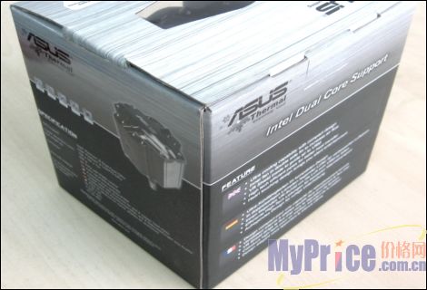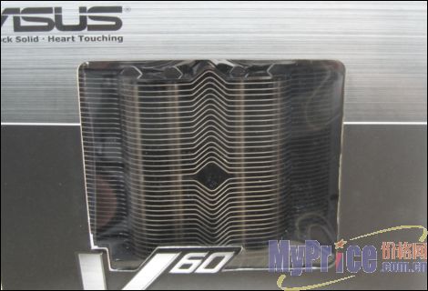 包装上有两个“窗户”,从侧面可以看出这是近年流行的塔式热管散热器,上方有非常显眼的ASUS的LOGO,提醒人们这款散热器一定不同凡响。