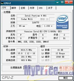 测试用处理器为P4 661(3.60G)通过调整倍频降为631(3.0G)核心代号为 Cedar Mill 采用全新65nm工艺制作,默认电压很低为1.232v。