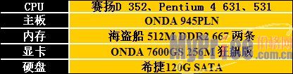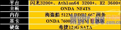 我们选择的平台在各个档次中除了CPU 不一样以外,其他硬件配置均一致,这样主要是方便大家对数据进行对比。目前1GB的内存也是目前网吧主流的配置,显卡选择的昂达7600GS 256M 狂飙版,其规格为Geforce 7600GS, 256M 128bit,核心/显存频率:450/1100Mhz。这里没有选择7300GT,是因为随着7600GS/GT的不断降价很快就会取代7300GT成为网吧市场的主流显卡。