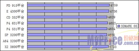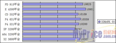 在3DMARK03测试中INTEL 平台全面领先AMD 平台,得分最高的依然是酷睿系列和奔腾D处理器。