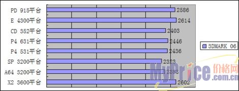 在3DMARK06的测试中,情况跟3DMARK03/05一样,虽然INTEL 945平台在内存运行频率方面落后于AMD平台(945PL芯片组仅支持双通道DDR2 533),但依旧是INTEL 平台全面领先,P4 631和赛扬D 352表现依旧非常出色。如果主板改用INTEL 945P芯片组(可以支持更高频率的内存),相信性能将还有大幅的提升。