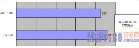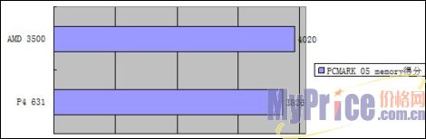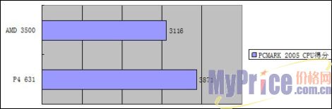 在PCMARK 2005测试中INTEL P4 631在CPU项目中大幅度领先AMD Athlon64 3500达到25%左右,但在Memory(内存)项目中却稍微落后于AMD Athlon64 3500+,这应该是AMD处理器将内存控制器集成到处理器内部的原因吧。