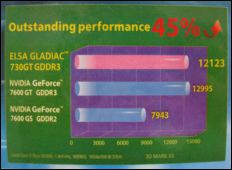 这款显卡的风格与以前的GLADIAC 730GT外观极为相像,但是性能差异非常大,显卡的默认核心、显存频率为575/700MHz,显存带宽达到了44.8 GB/s,理论上来说这样的带宽其实已经脱离低端显卡的定位,达到一般中端显卡的范围,甚至超越许多中端显卡,例如7600GS GDDR2版。