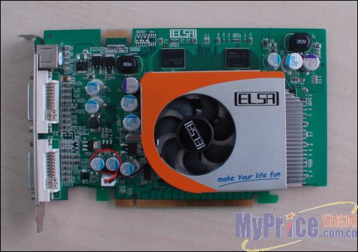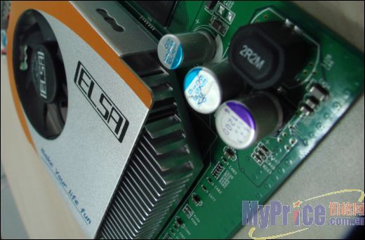 显卡风扇拥有银色磨砂质感的表面,ELSA和make you life fun的字样给人稳重、时尚的感觉。这个风扇下面就是高达575MHz的7300GT核心,NVIDIA公布的公版7300GT频率为350MHz,而影雷者730GT等于超出默认频率225MHz,相当于提高了64%!