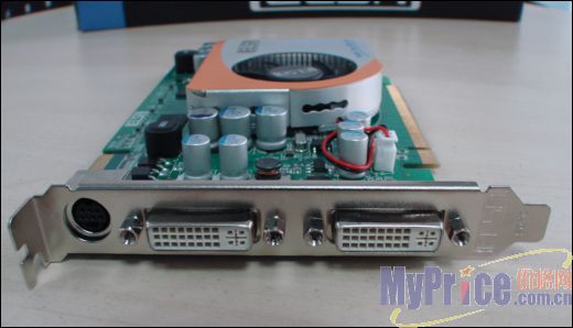这款显卡的接口为中端显卡常见的双DVI+S端,并且提供了DVI转VGA接头。显卡上方有MIO接口,用户可以组建SLI双卡并行方案。