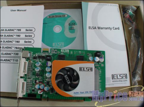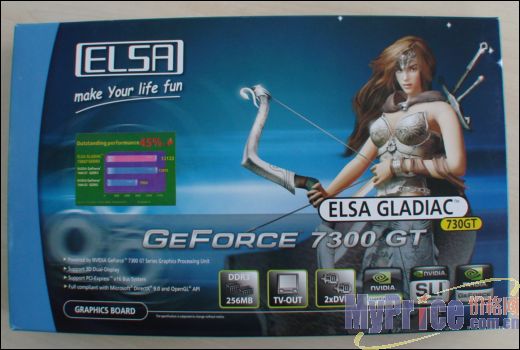艾尔莎730GT影雷者的包装风格十分靓丽,更靓丽的是上面的女战士^_^包装正面清楚地标明了采用DDR3显存和SLI技术,并且标识出3DMARK03分数几乎和公版7600GT持平,毫无疑问这款显卡可以归为目前规格最高的那一类7300GT当中。