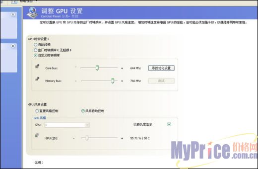 我们使用了NVIDIA的寻找优化设置功能,让系统自动查找出这款显卡的最佳频率,结果相当惊人:644/766MHz!