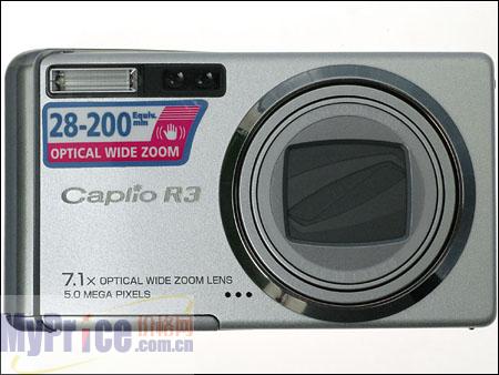 Caplio R3的 外观设计沿继了R系列一贯的风格,拥有一个2.5英寸的液晶显示屏,11.4万象素。外形尺寸95*26*53mm,165g 的重量既 小巧又轻便,很方便随身携带。自带26MB存内存,储介质为SD卡或MMC卡,使用1150毫安容量的可充电式锂电池,官方称每次最多可拍 摄310张相片。