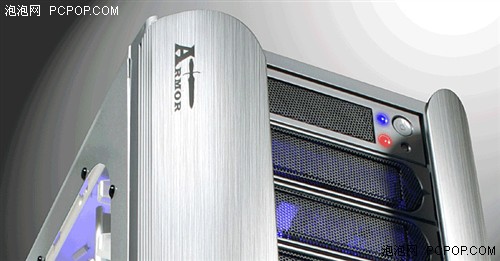 机箱顶部的内置接口组,包括了双 USB 2.0、IEEE 1394火线、音频和麦克风接口。机箱顶部由于少了全塔式ARMOR上部的通风设计,相较简化了不少。
