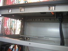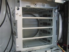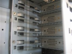 机箱内部变化比较大的就是前部的扩展槽了,5.25寸扩展槽并没有一通到底,而是只在上部布置了5个,下部变成了可移动直插式的硬盘托架,可最多放置4个硬盘,这种设计的好处就是便于拆装。