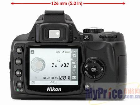 这款机器整机的重量只有475克,三围尺寸为126×94×64mm,相比以往的尼康相机来说,D40是最小巧的一款了,本身具有黑色和银色两种机身色彩,由于外型设计得非常紧凑,所以干脆取消了机顶信息液晶屏幕,所有的信息都在会显示在机背面的2.5英寸23万像素的液晶显示屏上。这款数码单反采用了五面镜取景器,取景器视野覆盖率为95%,放大倍率为0.8倍。
