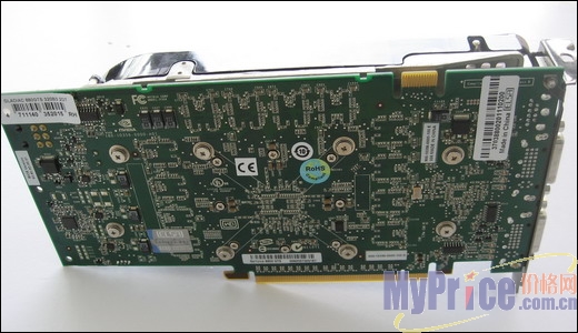 显卡背面布满了密密麻麻的元件,并且贴有产品流水编号、BIOS版本、型号信息、还有欧盟的ROHS标签,这款显卡虽然庞大但非常环保。