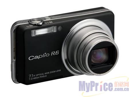 理光R6采用一块1/2.5英寸的741万像素CCD,最大分辨率为3072 x 2304。使用焦距等效于传统35mm相机的28-200mm、光圈F3.3-F4.8的7.1倍光学变焦镜头。ISO为 64-1600。并且拥有一个2.7英寸的液晶显示屏,具有23万象素。使用SD卡作为存储介质。电池系统使用型号为3.6V、1000mAh的DB-70的锂离子电池,可持续拍摄350张左右。理光R6机身重量约130克,外型尺寸是:99 x 54 x 20 mm。