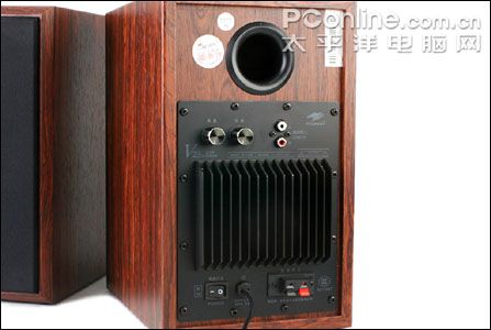 V23SE的倒相孔置于主音箱背部,同时,用以散热的大型散热片亦置于此,这样你就不必担心长时间使用音箱的发热问题。散热片上方一排是功能调节旋钮,从左到右分别是低音旋钮、音量旋钮、输入线路。散热片下方分别为电源开关、电源输入、副箱输入。对比V23,V23SE最大的区别就是去掉高音调节的主要原因是V23SE采用了免前级的设计,低音调节可以通过反馈电路作出来,而高音调节就不那么容易。