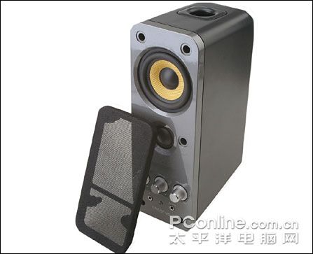 ??揭开防止音频单元受到人为损坏的黑色纺织网罩,我们可以清楚看到音箱的低、高音扬声器。据厂家资料显示,T20的低音单元采用的是黄色的2.5寸锥形玻璃纤维编织单元,它可以提供更精确的低频响应;而T20高音单元则是1英寸丝膜球顶高音单元,这能更有效地保证音质的纯正,使音质的细节表现更加细腻。