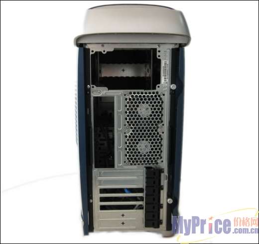 机箱后部设计得中规中矩,最上方是一个把手,下面是风扇的通风孔,最下面是PCI免螺丝扣具。