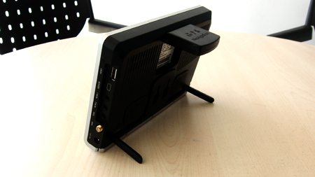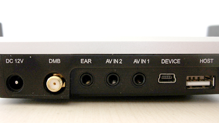 从该机坐车紧密的接口排列,暗示出该机丰富的功能。左侧接口依次为电源接口、DMB接口、耳机插口、视频接入口2/视频接入口1、mini USB口和标准USB口。