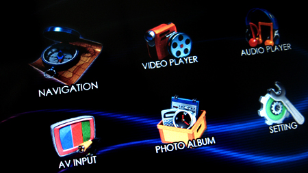 从桌面的图标上看,TM-100具有五项主要功能(不包括那个“设置”图标),除了作为一部导航仪必备的Navigationg外,还有Video Player(视频播放)、Audio Player(音频播放)AV input(AV电视)和Photo Album(相册)四项功能。