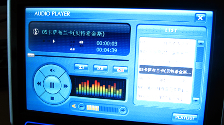 当我们需要播放音乐的时候,只要在桌面上用手指点击AUDIO PLAYER即可进入界面,进入后展现在用户面前的是如同仪表盘一样的界面布局:整体上分为三部分,右侧是LIST歌曲列表,坐上部分是歌曲详情,左下部分是操控区。整体的布局风格犹如车辆仪表盘,驾驶员看起来会感觉特亲切吧。