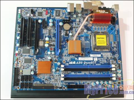 升技AB9 Quad GT是AB9系列里最强的一款主板,主板没有采用升技一贯的红色PCB,而是采用了蓝色的PCB底板,主板采用Intel P965+ICH8R芯片组设计,完美支持Intel Core 2 Duo/Quad/Extreme Edition/PentiumD/Pentium4及CeleronD等全系列LGA775架构处理器,不过想必没有人会用这种为四核酷睿而生的主板跑PentiumD。