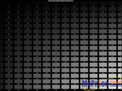 从测试显示器的灰度及256级灰度还原能力方面,黄色过度区域并不是太明显,但整体上还算比较平滑,特别是对于行业用户来说,这些对于日常的应用来说并没有太多的影响。