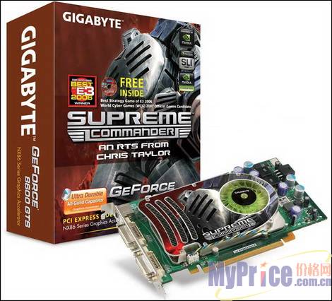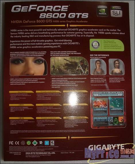 技嘉出品的G84有两款,其中技嘉GV-NX86S256H-B的包装非常COOL,红色主题中屹立着一个钢铁巨人,包装上有SLI和VISTA认证的标识,透漏出非凡的气质。