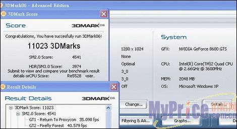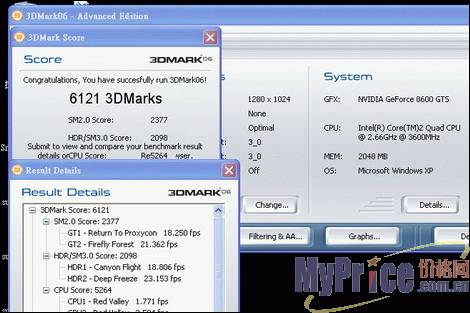测试平台为Intel Core2 Extreme QX6700,DDRII 1200 2GB,单卡成绩为6121,这个分数对比Direct×9显卡并没有价格优势。