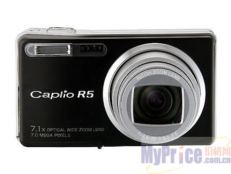 理光R5采用一块1/2.5英寸724万有效像素CCD,最高分辨率3072×2304。使用焦距等效于传统35mm相机的28-200mm、最大光圈F3.3-F4.8的7.1倍光学变焦的镜头。最高ISO1600,快门速度8-1/2000秒。配备了2.5英寸23万像素高亮丽LCD显示器。使用SD/MMC卡作为存储介质,机身内置26兆存储空间。电池系统使用3.7V、1150mAh锂离子电池,机身重量140克,外型尺寸是:96×55×26mm。