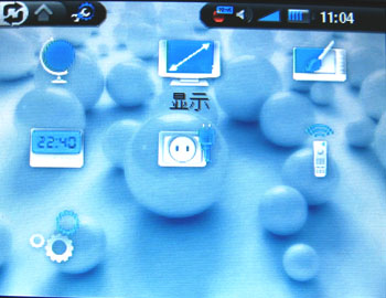 炫爱404主菜单采用9宫格设计,菜单背景图与菜单图标的显示颜色都采用了可调节设计,用户甚至可以抓取视频画面作为菜单背景图。显示菜单顶部为状态菜单,左侧为菜单切换栏,右侧为系统状态栏,包含耳机连接显示、音量显示、电池剩余显示、时钟显示。右侧为菜单栏,通过按动菜单按键可以呼出菜单进行调节。