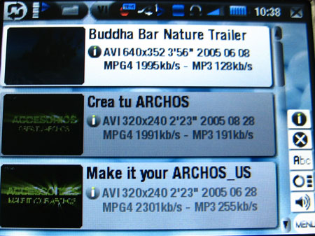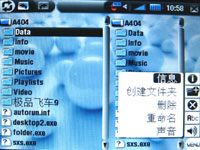 在文件管理上,爱可视一直都有着比较出色的表现,炫爱404也不例外;在音频功能中,不但可以清楚的看到文件夹的详细信息,而且还能在音乐播放的同时显示出专辑的封面显示信息;而在视频管理中,系统并没有采用常见的树形目录,转而采用的是缩略加注释的方式,用户只需在缩略图上就可以直接了解到影片的内容,并且整个影片处于预览的状态,十分人性化的设计。