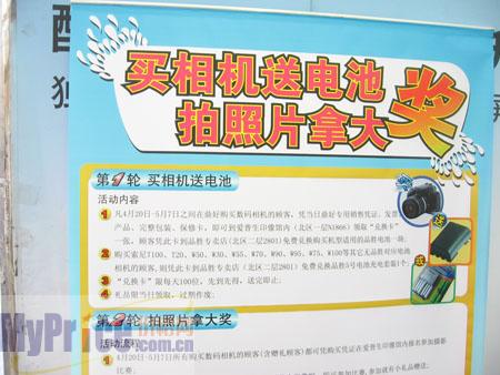 除了上述“派送”活动外,为了使用户再不必担心在半路断电、错过美景等“事故”的发生,从4月20日到5月7日期间,特别推出了“贴心服务、买DC配送电池”活动,在这一期间内到鼎好购买尼康、佳能等七大品牌数码相机时,还将使爱机获得足够的“电量”,只要每天购买DC的前100名顾客,凭借产品、完整包装和发票,即可在鼎好爱普生印象馆领取相应机型的品胜电池一块,而购买索尼T、W系列部分机型以及其他无品胜电池对应机型的顾客,则可领取品胜5号电池充电套装,可以说鼎好为广大的消费者设想的机器周到。