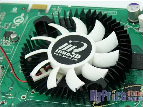 Inno3D GeForce 8600GT散热器采用黑色散热器配搭白色散热风扇,感觉清新令人眼前一亮,6cm的大扇叶低转速风扇,运行时十分安静,是一款静音显卡。