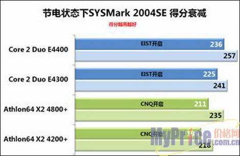 带着对EIST与CNQ技术的好奇,我们通过开启自动降频功能并运行SYSMark 2004SE来考察性能衰减情况。测试结果表明,Athlon64 X2 4800+在开启CNQ功能后性能衰减幅度最大,达到11.4%,4200+衰减幅度也达到9.5%之多。相对来说,Core 2 Duo E4400与E4300在开启EIST功能后性能依旧维持在较高水平,衰减幅度分别为8.9%和7.1%。