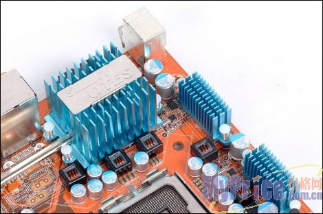 Conroe核心的Core 2 Duo处理器TDP仅为62W左右,因此其对主板处理器的供电要求并不是很高。不过考虑到处理器本身强大的超频能力,升技还是为处理器供电部分配备了豪华的五相回路供电设计,搭配半封闭式陶瓷电感和大量高品质固态聚合物电容,为处理器超频打下了坚实的基础。