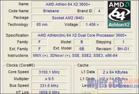 这款采用65nm制程的Athlon64 X2 3600+处理器硬件规格有了一些变化,其中最大变化是640KB×2的缓存规格,其中每颗核心提供128KB的一级缓存和512KB的二级缓存,二级缓存大小是90nm版本的一倍。