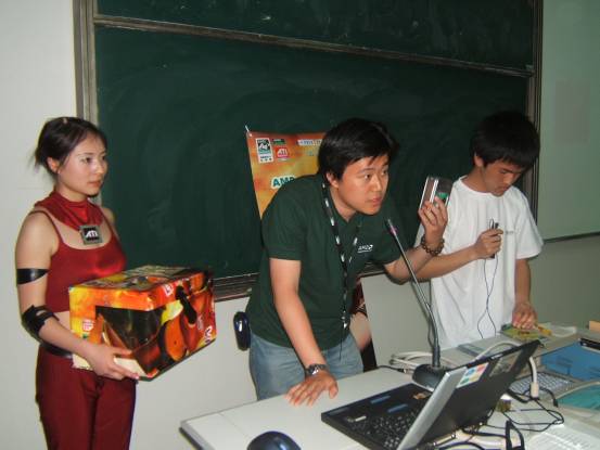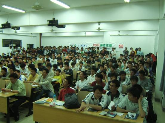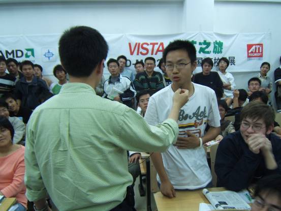 风景如画的校园从标语中不难看出学校培养实干型人才的决心走过路过别错过,“AMD-MSI VISTA绚芯之旅”校场内的活动宣传点人气火暴透明机箱真不错,仔细看看!同学们在认真填写调查问卷MM也来填写调查问卷有1/8欧洲血统的南京邮电大学RUBY这可是真功夫!培训会刚刚开始,已经全场爆满没办法,人太多了,挤在门口听哇,好多奖品啊!AMD华东区市场专员纪有为先生为同学颁发大奖AMD 视觉多媒体销售经理 帅海江先生也被现场同学的热情打动了帅海江先生亲自走到同学当中提问怎么报答同学的热情呢,微星上海总公司市场经理蒋红刚先生拿出大奖主板介绍中宇瞻科技华东区市场专员展凯先生也送出了1GB内存条 同学纷纷举手抢答问题