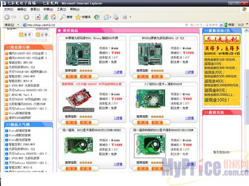 为迎接5.1大假,七彩虹电子商城早已备好充足的商品,等候您的光临!七彩虹NV原装主板680I SLI,680I LT SLI,650I Ultra,七彩虹逸彩G84/86系列显卡……琳琅满目的产品让人眼花缭乱!