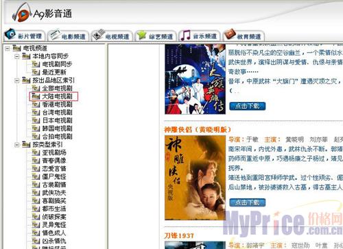 附注:A9影音通是爱可视与中国视听娱乐第一门户九州梦网联手推出一款MP4影音伴侣软件,是目前唯一一款专门为MP4提供内容服务而量身定制的客户端软件。而九州梦网作为国内最早购买正版网络影视运营的公司,与央视、VIACOM、MTV亚洲、SONYBMG、香港亚洲电视(ATV)、香港无线台(TVB)、华谊兄弟、海润影视、星传媒、八一电影制片厂等一百多家国内外知名影视节目制作发行公司都达成了版权合作协议,拥有国内最大最全的网络正版片库和数万小时的精彩节目。