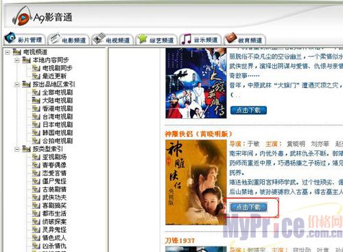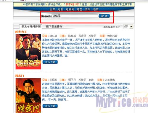 通过客户端左侧分类列表,用鼠标单击分类,可以按照不同类别查找出自己需要的分类;通过搜索关键字来查找,例如需要查找“万绮雯”的影视片,便可在search后的空白框内输入“万绮雯”然后点击搜索,《精武门》、《我和僵尸有个约会》等红极一时的经典剧集就马上出现在我们眼前。