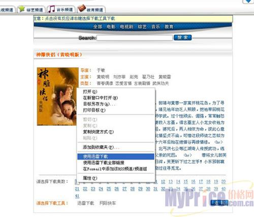 找到自己心仪的影片之后,现在我们要做的就下载了。在分类的列表页面,或者查询搜索的结果页面,点击影片名称、图片、点击下载等链接,均可进入影片详细页面,此时页面会出现集数,可以讯雷、网际快车等工具下载,也可以鼠标选择集数,右键选择目标另存放入您想存放的目录。