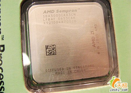 这款产品的编号为SDA3000IAA3CN LBBVF 0618GPMW”。具体意义解释为:SDA3000代表桌面用Sempron 3000+处理器,字母I代表Socket AM2接口,字母AA代表不同的核心电压(1.35V或1.4V)和最高功耗为62W,数字3代表256KB二级缓存;字母CN代表为Manila核心。另外安全码Q922812E60428与盒体上方标注的相同,大家在购买时一定要留意一下,以防遭遇不必要的麻烦。
