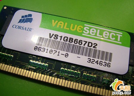 海盗船(Corsair)DDRII667/1GB内存正面粘贴了产品规格标签,可以看出产品属于海盗船(Corsair)Value Select(超值选择)系列,产品型号为VS1GB667D2,编号为0631071-0-324636,规格为DDR2-667,容量为1GB。
