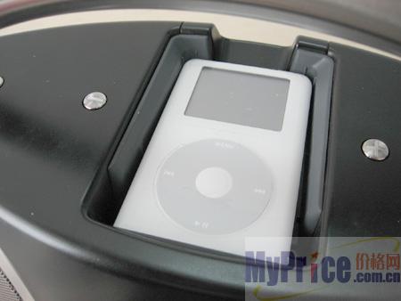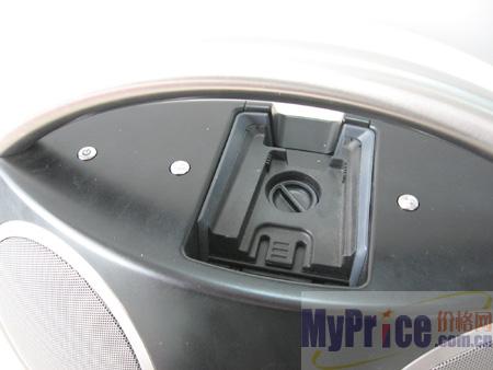 这是音箱顶部的iPod播放器插槽,与其他采用立式插槽的产品不同,为了能够令产品能够更好的“随身”,产品的iPod槽采用了卧式设计。在携带的时候能够更好的兼顾两款产品间的“稳定性”。另外,为了更好的体现iPod的视频显示(或者信息显示等),卧式接口也非一成不变。位于中部的旋钮可以旋转提升高度,在对iPod进行支撑。