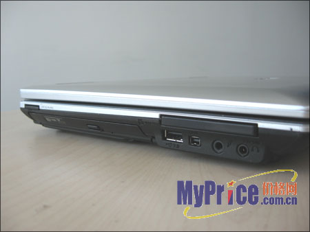 先来看看机身左侧,从左至右依次为MMC、SD、MS/PRO读卡器,DVD-Multi光驱,1个USB2.0,IEEE 1394,音频输入、输出和Express Card接口,布局紧凑合理,光驱由于采用了凹入式设计,操作起来稍有不便,不过使用起来噪音并不大。