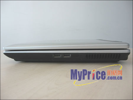 机身的右侧比较简洁,只设置了2个USB2.0接口、红外和本本的散热口,现在正值夏天,所以笔者认为这个设计比较失败。机身前面没有设置任何接口,本本的扬声器分布在两边的内侧,效果还不错。