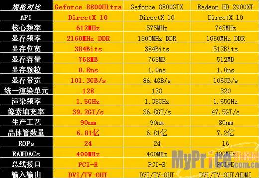 从规格上来看GeForce 8800Ultra与GeForce 8800GTX的区别仅仅在于频率,从575/1800MHz提升到了612/2160MHz,它是Nvidia为了击败R600“传说中的性能”卫冕冠军的产物,只不过AMD尚未解决R600良品率的问题,所以只发布了HD 2900XT而并非HD 2900XT。真是意料之中的战斗,意料之外的敌手。