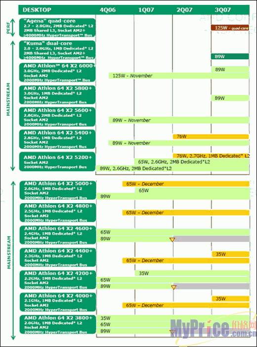 AMD第三季度的四核产品有1900+、2100+、2300+、2500+等,以上三类处理器均配备2MB三级缓存,都支持HyperTransport 3.0总线。AMD的四核产品比Intel的产品线更为丰富,并且功耗更低,性能方面未知,不过它们肯定会在第三季度引起四核大混战。