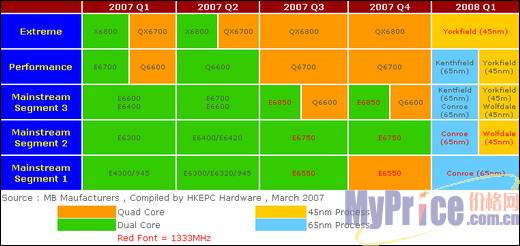 从Intel未来处理器规划来看,第三季度的四核产品有QX6800、QX6700、Q6600,Q6550在第四季度才会面世,不过不排会除迫于AMD的压力提前出台。